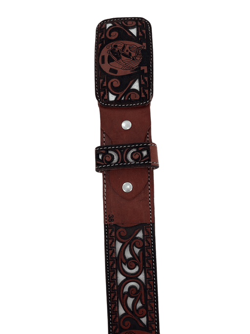 Brown and White Horse Head in Horseshoe with Light Brown Silk Thread Charro Leather Belt 2 Inch Wide Made of 100% Leather Silk Thread Design M...