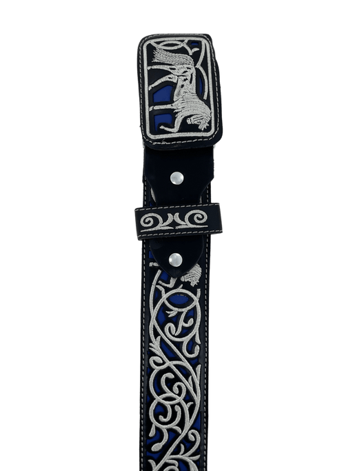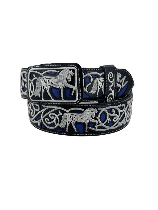 Black and White Horse Head in Horseshoe with Light Brown Silk Thread Charro Leather Belt 2 Inch Wide Made of 100% Leather Silk Thread Design Mad...