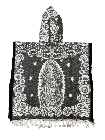 $29.99| /Youth Grey and White Virgen de Guadalupe Poncho/Gaban with Hoodie / Gorro