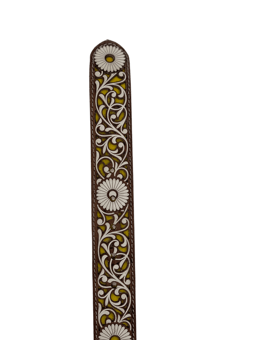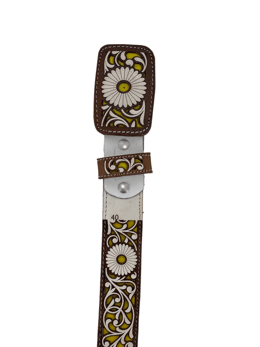 Cinturón de mujer de piel cincelada con bordado de girasoles en color marrón y amarillo y blanco