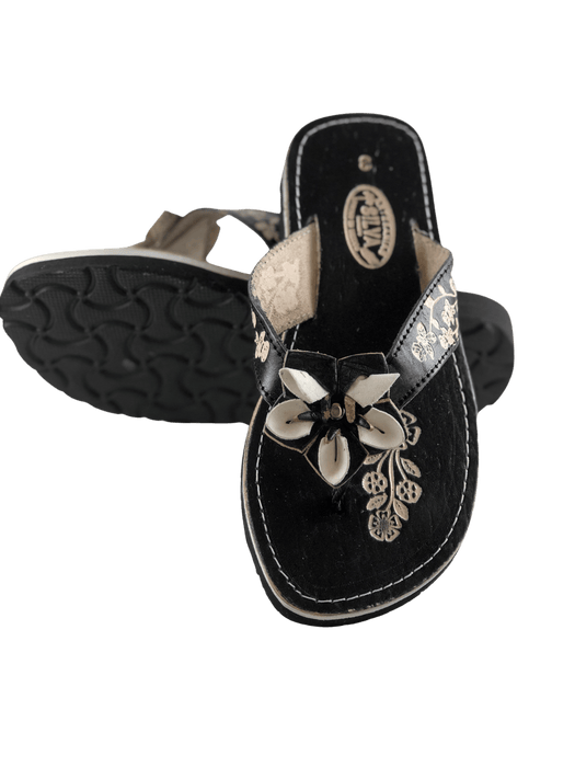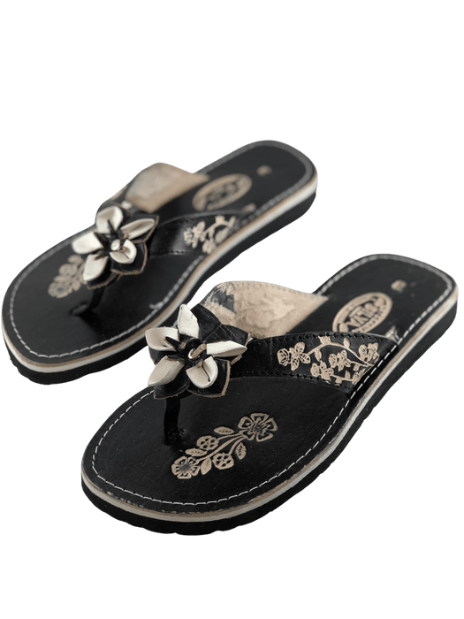 Leather Sandal - Black Flower Embroidery